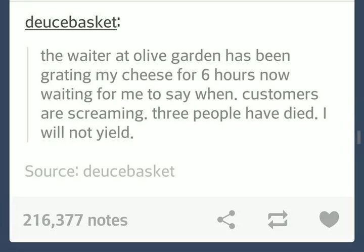 Tumblr Waiter Grating Cheese At Olive Garden Say When Funny Tumblr Posts Tumblr Funny Make Me Laugh